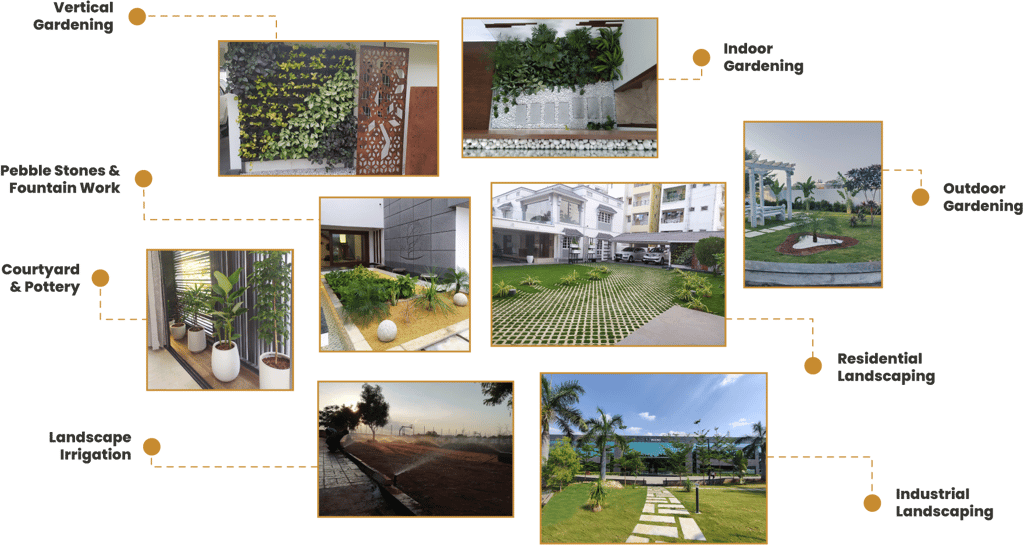 Our services also include efficient watering systems, lush indoor and outdoor greenery, and tailored landscaping solutions for homes and industrial areas, ensuring beauty and functionality in every project.